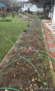 Начала укрывать розы.Внизу металлическая дуга,сверху арматура стеклопластик 8 мм.