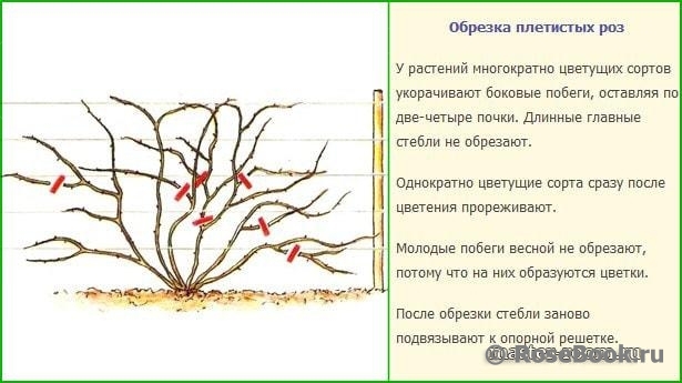 У всех вьющихся роз перед посадкой делается короткая обрезка.Для обеспечения обильного полноценного цветения у плетистых роз, а также сильного роста и вызревания побегов замещения И. И. Штанько и А. С. Лялина [1963] рекомендуют удалять в начале вегетации все лишние прорастающие почки (и в дальнейшем делать это систематически), ограничивать цветение, не допуская перегрузки цветками, так как это задерживает появление побегов замещения и угнетает их.Рекомендуется также оставлять на кусте 3—5 цветущих плетей и столько же полноценных побегов замещения.Т. А. Алейникова [1960] изучала цветение у вьющихся роз при весенней обрезке и пришла к выводу, что у сортов Эксцельза, Дороти Перкинс весной надо удалять все отцветшие двухлетние малопродуктивные побеги, оставляя на кусте только 4—6 сильных однолетних осевых побегов. У сортов Поль Скарлет Камбер и Нью-Доун надо весной сохранять все побеги в возрасте от 1 до 3 лет, включая боковые. Побеги старше 3—4 лет необходимо удалять. При обрезке вьющихся роз групп многоцветковых и вихура необходимо подходить к каждому сорту индивидуально и учитывать состояние каждого растения. Сорта, у которых от основания не всегда отрастают новые побеги, обрезают по мере необходимости, удаляя лишь старую древесину. Остальные же ветки, на которых в текущем году уже были цветки, следует ранней весной до распускания почек обрезать на 3—4 глазка. На некоторых оставленных главных стеблях появляются сильные боковые побеги. Если их осенью для лучшего вызревания обрезать до половины, то весной их надо обрезать на 3 хорошо развитых глазка у основания. В условиях Московской области при сильном подмерзании или подпревании, а также при поражении побегов грибными болезнями (особенно инфекционным «ожогом и серой гнилью»), когда их приходится резать коротко, цветение этих групп в текущем году не наблюдается [Михайлов, 1965; Номеров, 1965]. Особое внимание при культуре плетистых роз следует уделять вопросу сохранения однолетних плетей. До заморозков их листья необходимо оборвать, побеги связывают шпагатом и пригибают к земле, а после заморозков под связанные плети кладут лапник. Сверху их также накрывают лапником, поверх лапника насыпают торф или землю слоем 10—15 см. При таком укрытии плети сохраняются довольно хорошо: не подмерзают, а главное — очень редко поражаются инфекционным «ожогом» [Штанько, Лялина, 1963]. У многих сортов в северо-западной части России (Ленинградская область), кроме сорта Ныо-Доун, побеги необходимо сохранять на всю длину и только самые верхушки с недоразвитыми почками можно удалять. Сорт Нью-Доун стоит особняком в ряду плетистых роз [Козьминский, Вечерябина, 1972]. У него, как у чайно-гибридных и полиантовых роз, любой побег, откуда бы он не появился, зацветает в первый год вегетации. Поэтому сорт Нью-Доун можно культивировать как плетистую, как парковую и как кустовую розу. Чтобы выращивать розы сорта Нью-Доун в форме низких кустов для посадки на рабатки и клумбы, весной их подвергают сильной обрезке. При ежегодной систематической обрезке кусты сорта Нью-Доун не превышают 80—100 см, но образуют сильные побеги замещения и внешне напоминают кусты чайно-гибридных роз. Плетистые розы сорта Рамблер требуют прочистки усыхающих, поврежденных или устаревших ветвей и обрезки верхушек буйно растущих побегов. После летне