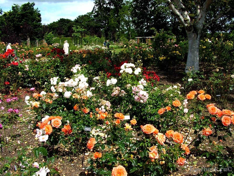 Городок St Albans в 15 минутах езды на электричке от Лондона, знаменит своим собором. В честь него Остин даже назвал одну из своих роз. Однако, помимо этого, в Сен-Олбанс находится розарий Национального Королевского Розоводческого Общества Великобритании (RNRS). Сад довольно старый, но недавно реконструирован - в 2005 г был почти полностью обновлен и перепланирован. Перепланировкой занимался известный английский дизайнер Майкл Балстон (обладатель золотой медали на Chelsea Flower Show). Сейчас там растут около 8000 роз примерно 2000 сортов. Войдя в сад, мы оказываемся на «пути президента» - дорожке, по кругу огибающей сад. Вокруг нее – красивые миксбордеры с розами, скомпонованные по цвету – от нежных до самых ярких.
