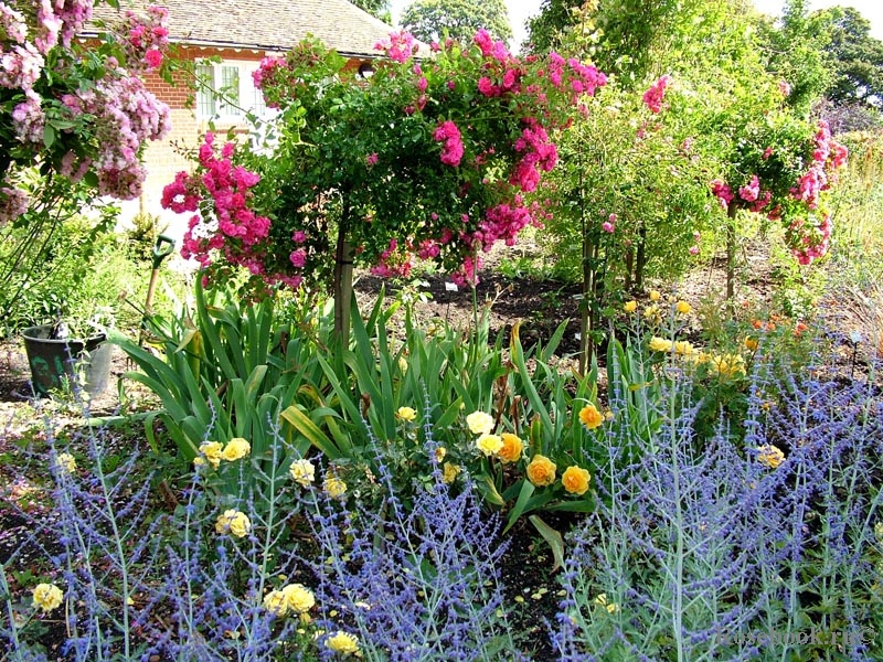 Пройдя чуть дальше, мы оказываемся в Queen Mother’s Garden – эта старая часть сада оставлена почти без изменений. Здесь высажены любимые сорта королевы, которая является патронессой общества. Роскошный рисунок на газоне, напоминающий кельтские орнаменты, окружен серебристо-бело-синими миксбордерами. Здесь можно поучиться компоновке роз с растениями-компаньонами. Очень понравилась почти неизвестная у нас Salvia Argenteum. В качестве подбивки повсеместно используются шалфеи, бадан, гейхеры, разнообразные злаки. Много луков.