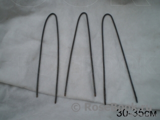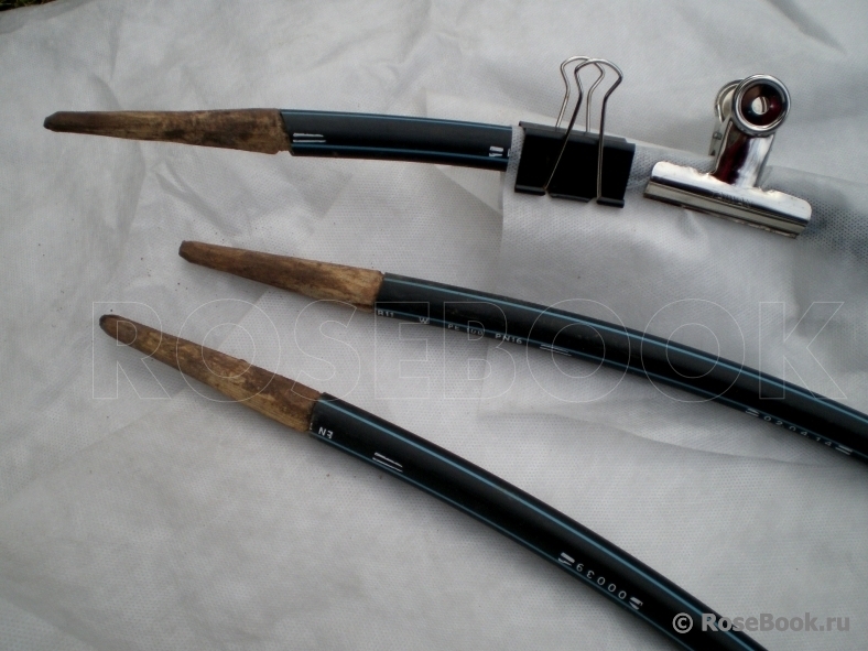 Попробовала закреплять над укрытием пленку таким способом,чтобы она не касалась земли и не вмерзала. Укрытие делаю по дугам из водопроводных шлангов,поставленных крест-накрест.В шланги вставлены деревяные наконечники,что дает возможность хорошо заглубить опору в землю. Длина шланга в 2м дает высоту укрытия до 70см. Диаметр шлангов хорошо вписывается в канцелярские держатели-укрывной материал не смещается и не срывается при любых ветрах.