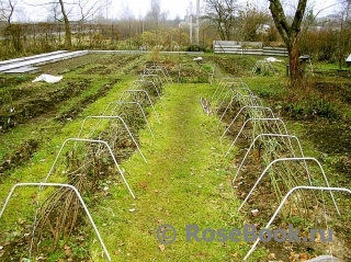 Поверх щитов настилаю целую полиэтиленовую пленку (можно использовать и ту, которую снимаю осенью с пленочных теплиц). Если одного куска пленки не хватает, настилаю два-три внахлест и хорошо их закрепляю, чтобы не сорвал ветер. Торцы укрытий роз оставляю открытыми до начала ноября (до устойчивых небольших морозов). Заморозки до -6°С не вредят розам. Заранее подгоняю подходящий материал для торцев (использую ДВП, отходы досок, фанеру). После замерзании почвы под укрытием при устойчивом похолодании забиваю торцы и опускаю на них пленку. Если розы растут одиночно, то для их укрытия использую ящики, которые в начале октября накрываю сверху пленкой, а наверх кладу укрывной материал (лутрасил, спандбол). Мокрый снег и дождь не должны попадать вовнутрь, ведь влага наиболее опасна для перезимовки роз. Если на щитах лежит слой снега хотя бы 10 см, то температура под укрытием даже в самые сильные морозы не снижается ниже -5-8°С. В морозы внутри все покрывается толстым слоем инея, иглы которого достигают 10 см. При длительных оттепелях он тает медленно, в это время температура внутри укрытия не поднимается выше 0°С. В таком случае не создаются условия для размножения патогенных грибков. Наиболее успешная зимовка побегов роз возможна при условии, что они с момента укрытия и до весны будут находиться в замороженном состоянии. С ноября до середины февраля солнце не прогревает пленку, поэтому нет опасности преждевременного роста и выпревания растений. Под воздушно-сухим укрытием на побегах роз редко образуются морозобоины коры. Окучивание я не провожу. Испытал различные варианты, но никакого улучшения перезимовки они не дали. Даже стало хуже. Под окучкой, если она намокала, появлялись морозобоины. Но если сделать так, чтобы материал или почва оставались сухими всю зиму, тогда есть смысл окучивать отдельно стоящие невысокие розы, например чайно-гибридные, флорибунда. При очень длительных оттепелях желательно приоткрыть торцы укрытий, чтобы избежать выпревания побегов роз. В теплые зимы я часто оставляю отдушины для проветривания растений. Данный способ укрытия имеет ряд недостатков: - одному человеку трудно установить такие щиты; - в феврале-марте трудно регулировать температуру под щитами, розы начинают прорастать и заболевать. Чтобы этого не происходило, нужно находиться рядом с розами и вовремя открыть торцы; - невозможно установить укрытие на фигурных посадках; - щиты нужно где-то складировать, они занимают много места. Преимуществом данного способа является его дешевизна, а так же долгий срок службы этих щитов. Любое воздушно-сухое укрытие желательно устанавливать на группу, а не на одну розу, иначе приходиться ее лучше укрывать, следовательно, под щитами будет мало воздуха. Он должен служить буфером для сглаживания резких скачков температуры, чтобы розы успели приспособиться к таким изменениям. В укрытии всегда тепло, нет ветра. Чем больше пространства охвачено, тем теплее внутри во время морозов. Если кусты роз высажены в композиции с другими растениями, то из-за нехватки свободного места укрыть их таким способом будет сложно. Можно воспользоваться и другим способом: затянуть сбитый каркас стеклотканью. Он должен быть таким, чтобы стеклоткань не провисала от мокрого снега. Воду данное укрытие практически не пропускает, «дышит», прекрас