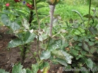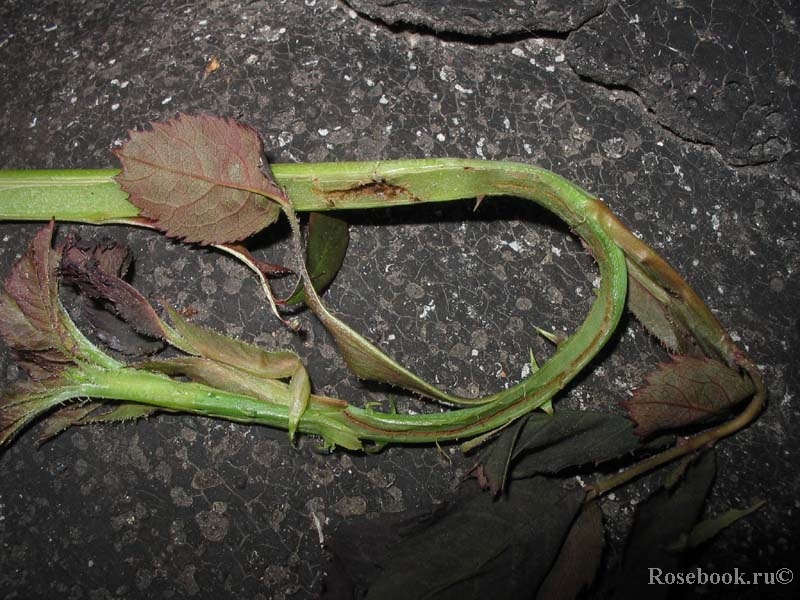 Молодые побеги роз весной неожиданно вянут (обычно самая нежная молоденькая макушка) и постепенно засыхают. При этом увядание начинается не от основания, а с определенного места на побеге. Если отломить побег в этом месте, можно увидеть «ход» - сюда самка пилильщика отложила яйца. Сам вредитель - желто-белая гусеница со светло-коричневой головой.