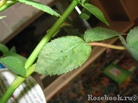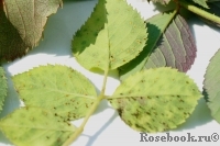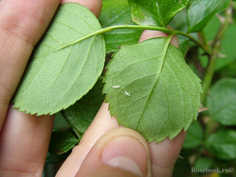Листья становятся покрываются мелкими бледно-желтыми крапинками, светлеют, сильно пораженные опадают, а у основания побегов в запущенных случаях появляется «паутинка». Вредителя при желании можно разглядеть – на нижней стороне листа мелкие белые крупинки – это и есть клещик. Появляется в условиях сухого воздуха, и поражаются паутинным клещиком обычно комнатные или тепличные розы.