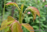 Листья роз свернуты в трубочки, как сигары, соседние листья погрызены. Вредитель - мелкие желтые или серо-зеленые гусенички, живут внутри свернутых листьев.