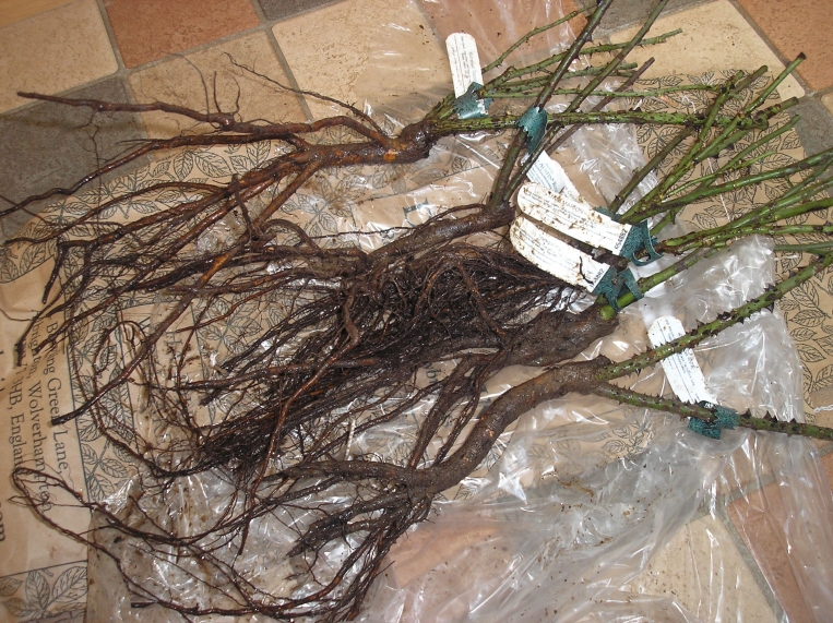 Получила мои первые остинки, пришли именно тогда, когда просила, сервис - без вопросов, а вот по качеству саженцы очень отличаются друг от друга. Видела фото на форуме, какие красивущие саженцы остинок девочки получали, ожидала такого же. 3 из 6 - превосходные, еще 2 - хорошие, а вот Princess Anne - под большим вопросом. 2 веточки, маловато будет, но это еще ничего. Корень-морковка обрублен и видно, что гнилые концы. До этого был Кордес и такого не было ни одного саженца из 20, а их цена в 2.5 - 3 раза ниже остиновских. Ожидала все-таки соответствия между ценой и качеством. Все равно посадила. Саженцы на гарантии 12 мес, посмотрим, может и нормально пойдет Принцесса. На фото - она внизу. Ну и я, конечно, далеко не спец, но, по-моему, привиты все на разные подвои. Кто как думает? Еще у нее повреждения вверху этой морковки.