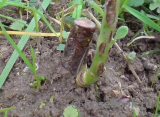 Казалось бы, остаётся только осенью выкопать розу и пересадить на новое, постоянное место… И вот тут-то и начинаются основные ПРОБЛЕМЫ… Если выкопать такую привитую розу, просто обрезав «провод-корень» и пересадить, то выясняется, что лысая, обрубленная «корневая» (без мочковых отростков) на новом месте просто не тянет уже хорошо развитый привой. Происходит что-то наподобие черенкования, т.к. корень представляет собой и «ведёт себя» как обычный, глубоко вкопанный, длинный черенок. Вот и получается, что в этом случае с уже привитой розой нужно проводить те же нуторные манипуляции и процедуры, что и при черенковании (накрывать бутылкой, притенять, постоянно опрыскивать листья, увлажнять грунт и т.д.). Без таких процедур привой по весне изначально бурно идёт в рост на накопленных «старых дрожжах», потом останавливается в развитии, далее деградирует и постепенно отмирает, так и не укоренившись. Можно выйти из положения, если заранее, летом (или след. весной), не выкапывая прививку и не нарушая её «корневой», попробовать лопатой отсечь привитую розу от общей подземной системы «проводов», дать ей время на родном месте нарастить мочковые корни (исходные, тонкие зачатки которых, думаю, у неё всё же есть), а затем уже осенью пересаживать. Проблема определить, где проходит «провод». Отсекать приходится наугад всё по кругу от прививки, глубоко врезая в землю штык лопаты. Привитые розы, пересаженные таким образом, прижились довольно успешно (хотя и с бОльшими проблемами, чем купленные, на культурном подвое). Сам данный шиповник-подвой, как вид, очень «болявый». Такое ощущение, что он хватает все виды инфекции, которые только есть в природе (различные пятнистости – на любой вкус и цвет, ржавчину, МР, ЛМР и др.). Заболевает самый первый в саду!!! Из всех качеств положительное только одно – удивительная морозостойкость. Даже самые тонкие веточки перезимовывают открыто без всякого видимого ущерба в любые морозы. О морозостойкости «корневой» вообще молчу. У данного способа есть ещё недостатки: 1. Неожиданное отмирание зелёной части штамба подвоя ниже уровня уже прижившейся и выросшей до 30-40 см прививки (или за ней). Иногда отмирание начинается выше уровня, там, где подвой обрезается «на глазок», а затем перекидывается вниз. Штамб подвоя сначала желтеет (вместе с привоем), а затем и погибает, как при ИО. Такой некроз подвоя в этом году отмечался у 20% прививок. Причина отторжения штамба пока неясна. Подозреваю, что имеет место инфицирование привоя или подвоя спорами ЛМР. Результат – ослабление и отторжение.