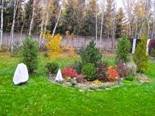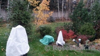 Столкнулась вот с какой незадачей … Вчера мужж , увидев процесс укрытия роз, грозно и беспрекословно рявкнул, что я своим ку-клус-кланом и белыми могилками из тряпки испоганила весь вид на клумбы, что он не для того проводил дорогущее садовое освещение , чтоб подсвечивать сее безобразие и лицезреть оное 6 месяцев в году. И его категорически ЭТО не устраивает . Либо украшай как хочешь, либо в следующем году роз тут не будет… Так вот, сказал не в бровь , а в глаз. Теперь голова моя томится не только правильностью укрытия , а и украшением этого укрытия. Пришла в голову идея украсить цветным/ с рисунком спанбондом, но перешерстив весь инет в зоне Москвы НИЧЕГО НЕ НАШЛА! Только в Питере есть фирмы , торгующие цветным спанбондом и то рулонами по 250пг/м . Может кто-нибудь когда-нибудь покапал себе что-то подобное?