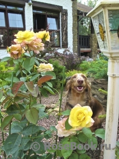 Чудесные розы и песик =). А вот наша соседская кошка (наша, т.к. живет все лето у нас ,на своем участке собак слишком много ,у нас отдыхает) обожает тереться о стебли роз,невзирая на любые шипы и колючки. Сначала ее оттаскивала, потом поняла, что сама разберется.Или заваливается в самые кущи розовые,колючие и там спокойно спит.