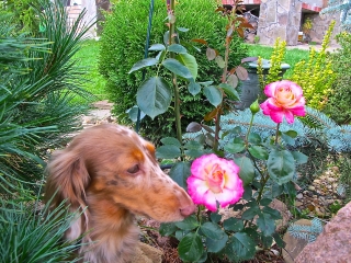 Спасибо :) Да это такса длинношерстная и она любит не только нюхать , но и грызть , за что получила второе имя - Шредер ))) Пока я высаживала саженцы роз, она все рядом крутилась, помогала ямки рыть ( любимое дело ) и периодически пробовала на зуб стебли ....