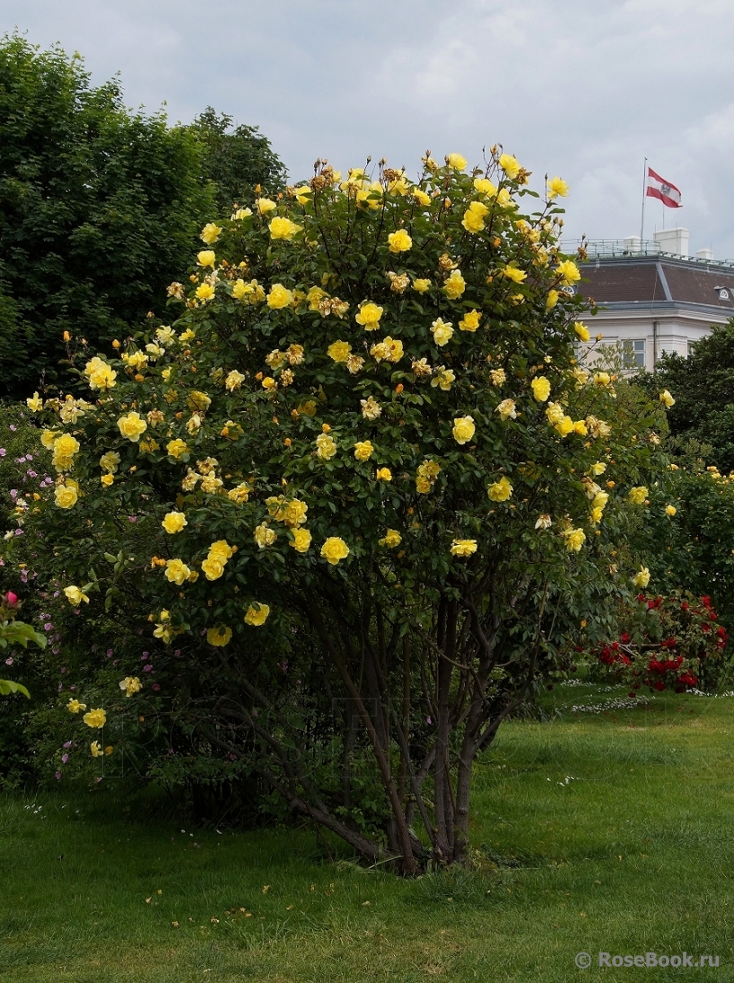 | вот куст ранней розы на фоне глицинии |