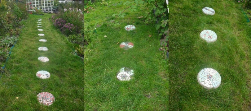 Восхитительная дорожка у Вас! Я так думаю, что в ход пошли отслужившие свой срок посуда и плитка ? Если ошибаюсь - расскажите, поделитесь подробностями, как пришла такая идея. Именно круглая плитка, да ещё с мозаикой. Чудо, как хорошо!!!