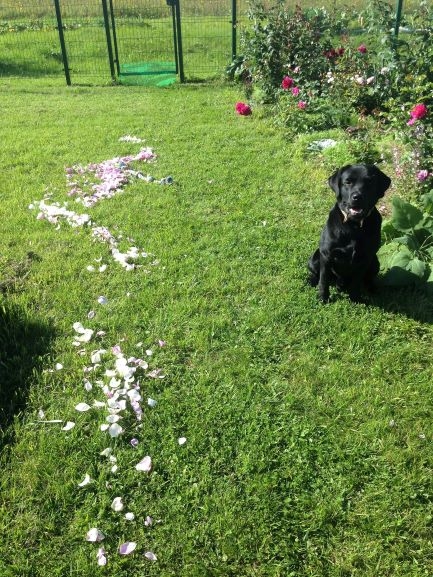 Собирала отцветшие лепестки в ведерко и что-то отвлеклась на смски. А песик тут как тут: "Мааам! Ты ведерко забыла, я тебе его принес!!" :))