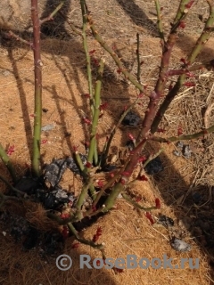 Побеги есть зеленые, есть коричневые, но почки везде, поэтому оставила. Вторая розочка, которая покоричневела наполовину, отрастает в основном от корней или от самого низа побегов. Но пока не обрезаю, т.к. местами вроде маленькие розовые почки тоже есть.