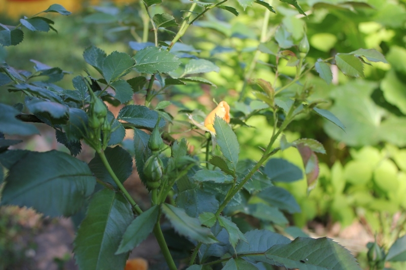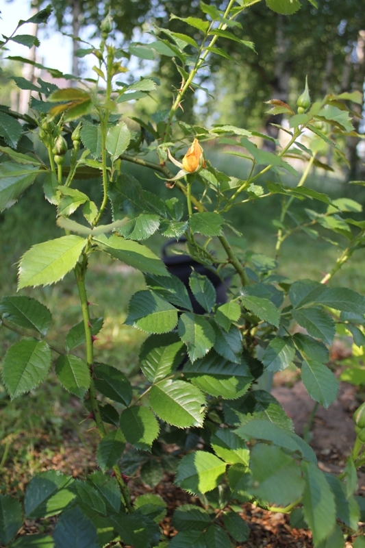 Стояла среди плетистых с бамбуковой опорой, так что делаю вывод, что плетистая:) Перезимовала роза отлично, по всей длинне и расцвела в этом году первой почти в полной тени! Покупкой довольна, розочка очень понравилась, теперь бы узнать ее имя:) Цветок полумахровый, некрупный (ок 5 см), желто-оранжевый, пастельный, нежный, ароматный (на мой нюх чуток отдает клопами:))), с милыми тычинками. Кисти цветов по всей длине побега (но возможно это связано с тем, что я ее не поднимала, не знаю) Бутон заостренный, совпадает по цвету с раскрывшимся цветоком. Первый цветок в глубине куста раскрылся, в самом низу. Листва блестящая, крупная, кожистая, очень здоровая, в прошлом сезоне осенью ни одного повреждения не было. В этом сезоне правда пострадала от цикадки, но у меня почти все розы объели пока я сообразила с чем бороться:( Шипы на молодых побегах очень длинный, красные, потом светлеют и укорачиваются, шипы только внизу побега. Молодые побеги почти без красноты. Ну вот вроде и все:) Про продолжительность цветения пока ничего неизвестно, только первый цветочек распустился:) Но точно не однократка,т.к. бутоны и на прошлогодних побегах и на новых тож (хотя новые побеги пока только от низа существующих, от прививки новых не видно) Помогите опознать?:)