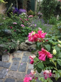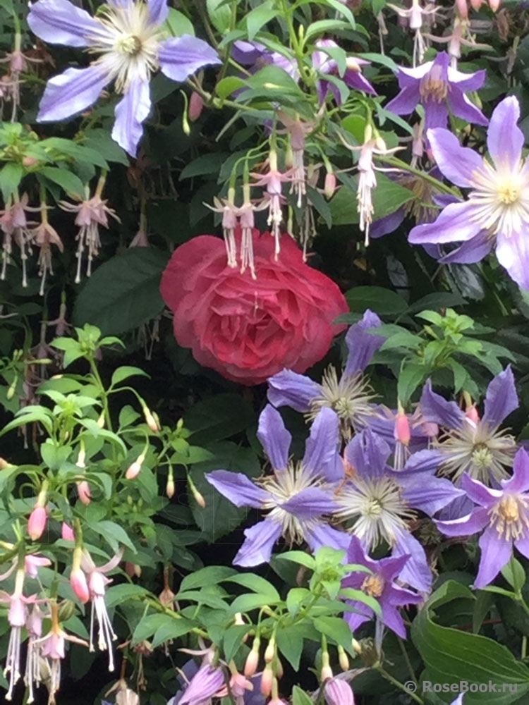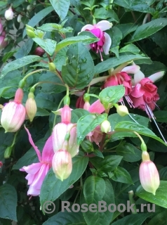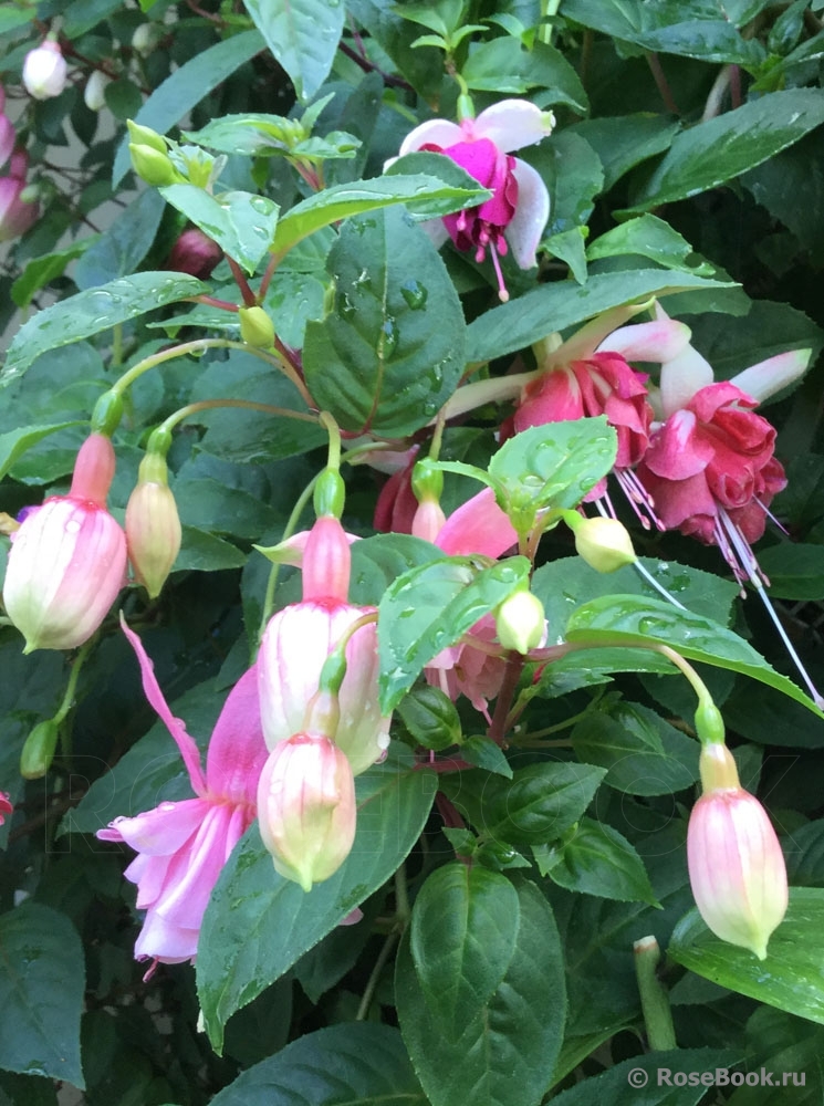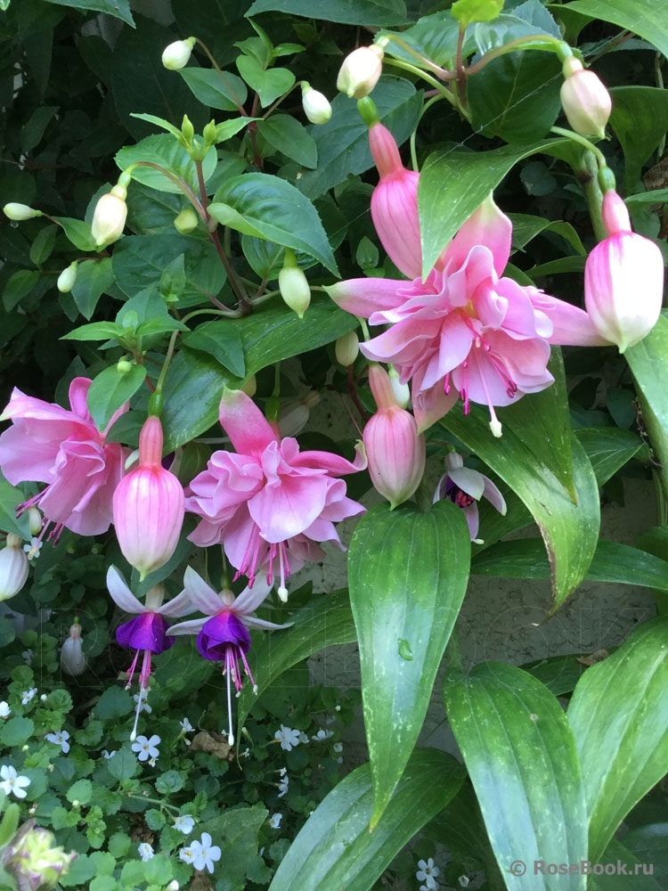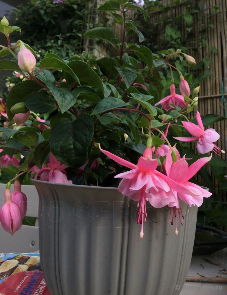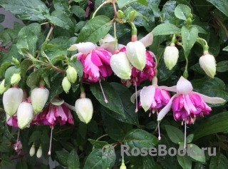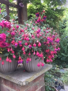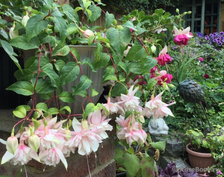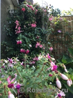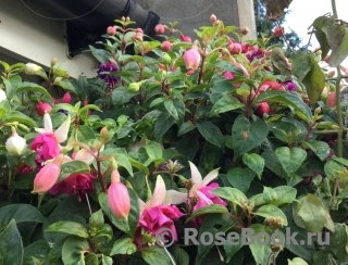 Очень люблю фуксии за их неприхотливость, за их любовь к дождю (что очень важно в нашем климате). За то, что у них красивые, необычные цветы с длинными тычинками. Такие изящные, танцующие балеринки с простыми или двойными, красиво уложенными лепестками - юбочками. И расцветки такие, что любые другие цветы могут позавидовать. Сажаю фуксии в горшки, в ящики под окнами, в подвесные корзины или в землю между другими цветами и розами. На зиму горшки с фуксиями ставлю на землю под кусты. Весной обрезаю веточки до новых листочков, рыхлю, добавляю или заменяю верхний слой почвы на новый. Несколько раз подкармливаю за сезон - все так же, как с розами. Фуксии предпочитают тень и ежедневное опрыскивание водой. В конце сада, у забора у меня растет огромная фуксия. Я сформировала ее как дерево. Толщина ствола около 5 см. Весной обрезаю все ветки очень коротко, оставляю небольшие пенечки на кроне (на высоте около 1м.70см). Растет очень быстро и к концу сезона почти не уступает плетистой розе Rosanna. Фуксия с весны и до осени вся усыпана маленькими цветочками (длиной около 3 см) - такое розово-сиреневое облако.