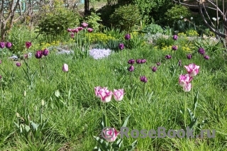 Пока не распустились листья на кустарниках, сад прозрачен и все кусты роз видно. Цветущие тюльпаны взяли на себя функцию украшения сада, я их специально сажаю кучками между розами, чтобы отвлекали внимание от голых побегов.
