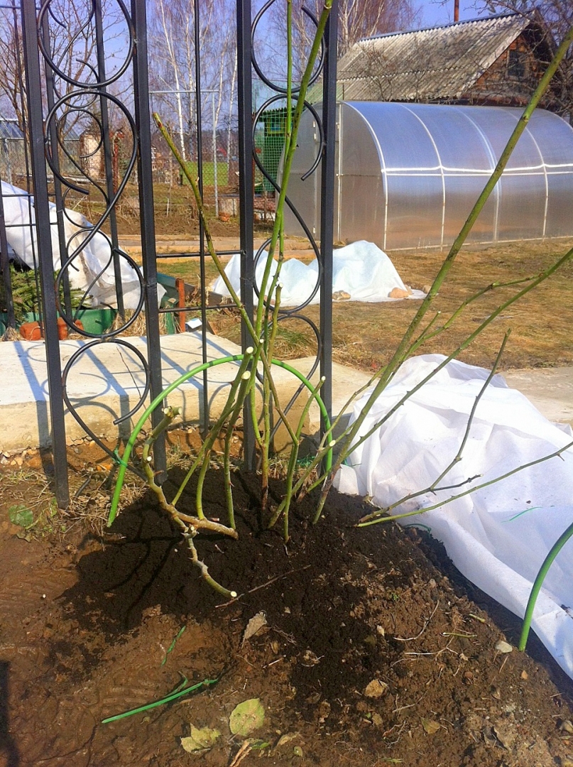 Отдельно напишу про мою Mme Alfred Carriere - очень за нее волновалась! Осенью при укладке было видно, что побеги не вызрели до конца, не хватило ей нашего короткого лета... Но она перезимовала!!! Часть побегов была в черных пятнах, я некоторые вырезала совсем, некоторые укоротила - слава богу, побегов было много! Но в целом роза молодцом!!! Ура!
