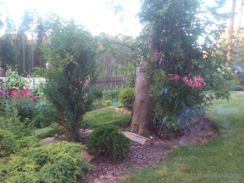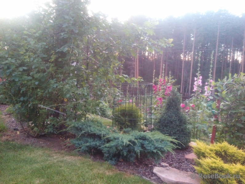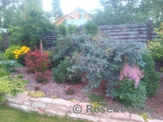 Когда то, я тратила много времени на прополку вокруг растений. Осенью, мой сад становился унылым и каким то грязным. По прошествии времени я поняла, что надо менять ситуацию и располагать растения так, чтобы было приятно смотреть в окно в любое время года, да и меньше тратить время на уход. Так и родилась идея смешанного сада. С большим кол-ом хвойных, разбавленных лиственными растениями. Сочетание различных по характеру и цвету растений создаёт непрерывную цветовую картину. Например, когда роза оцветает, зацветают гортензии. Почему то ещё везде "просочились" лилии, разной высоты, формы и цвета. Если грамотно продумать хвойные по высоте( задний план), затем кусты, а в "ноги" маленькие медленно растущие карлики. Участок у меня не большой, приходится растения плотно сажать друг к другу. Я даже рада, плотное размещение и неглубокие посадочные ямы, сдерживают рост растений. Если чуть- чуть подкормишь растение, оно бешенно идет в рост. Так что все "на голодном" пайке. Рядом с хвойными прекрасно растёт Роза- сизая, одно из самых любимых растений. Огромный куст, ничем не болеет, ничем не опрыскиваю ( если только попутно, проходя мимо), весь усыпан мелкими цветочками, к осени симпатичные плодики ( как у шиповника). Роза разрастается молниеносно. Приходится её ограничивать( хотя недавно прочитала, что она этого не любит). Посадила ее во всех местах, где только можно. Плетистая роза Алхимист (была посажена к старой облезлой сосне) и неизвестная парковая роза ( цветет мелкими белыми цветочками однократно). Вокруг растений все застелено спандбондом и засыпано щепой или торфом. Не очень красиво, когда роза оцветает, если не успеть срезать соцветия, вся щепа усыпана лепестками , но не долго. В таком виде мой сад уже четвёртый год. Смело скажу, что сочетание хвойных и лиственных не только красиво, но и удобно.  | | Роза сизая была втиснута между голубой елью и туей Брабант |