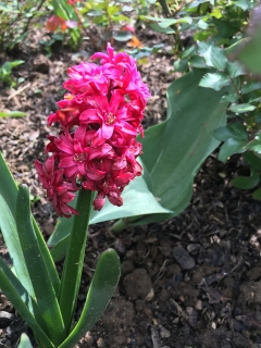 Одновременно еще продолжают цвести гиацинты и декоративная краснолистная яблоня
