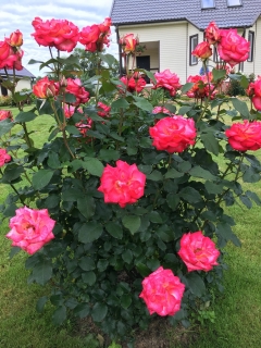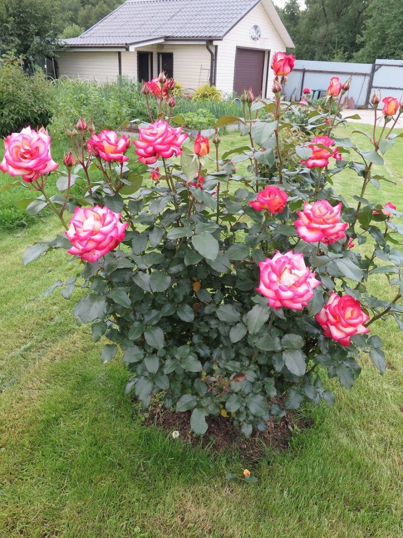 Лето 2017года, как все помнят, началось у нас на месяц позже. И все розы это конечно заметили. Цветение началось в июле. Было относительно много слепых побегов практически на всех розах, но не моей красавице! На третий год жизни в моем саду она показала себя во всей красе! Куст метр на метр. Никаких болезней. Цветение непрерывное. Цветок держит дней 10, не боится ни дождей ни солнца. Во второй половине лета может дать удочки, но не критичные.