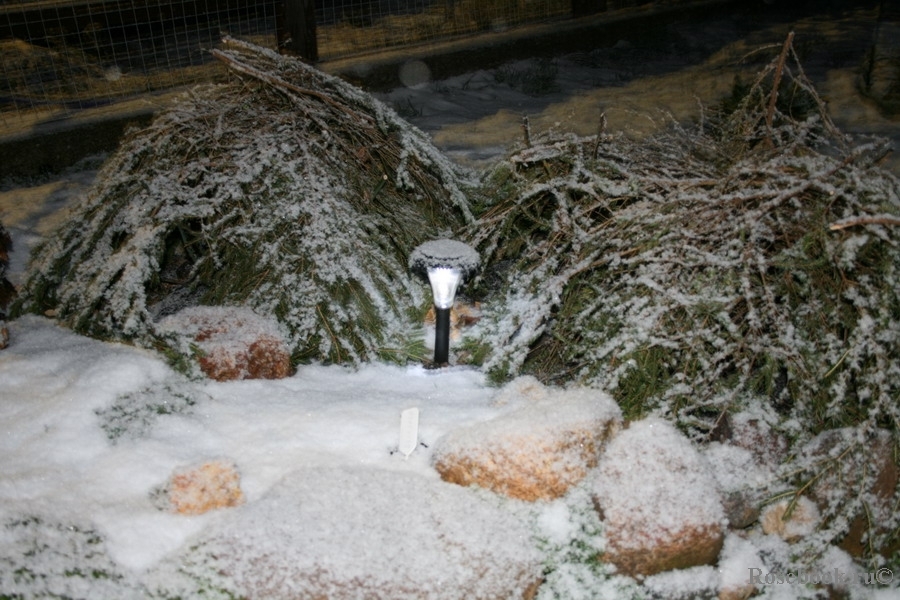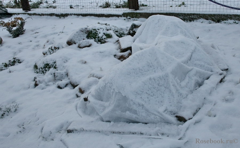 Наконец в прошлые выходные (13 ноября) окончательно укрыла все розы: ещё раньше окучила землёй, потом обложила лапником, а теперь натянула поверх два слоя "Агроспана-60". Перед окучкой опрыскала трёхпроцентным раствором железного купороса.