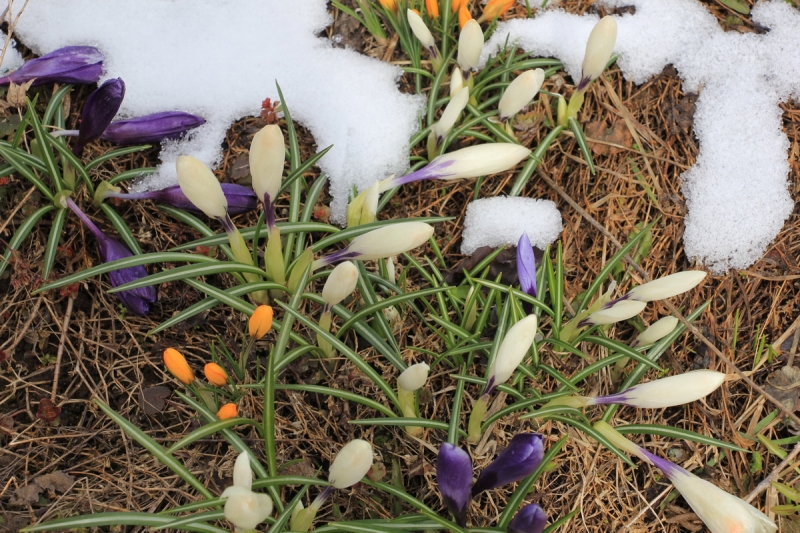Однако пока мы возились со всякими садовыми делами, солнце успело изрядно растопить снег и прогреть воздух до +1 градуса. И - настоящее чудо! - крокусы стали оживать, из-под снега показались тюльпаны, чеснок проткнул снег своими зелёными стрелками...
