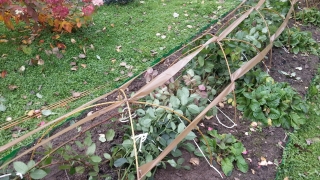 | Дуги из спа №6 , крест на крест над каждым кустом. Сверху пластиковая сетка. |