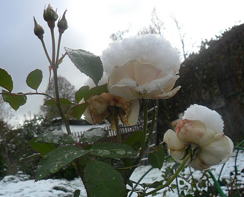 Вернувшись темной ночью из Москвы, куда ездила на пару дней для встречи с новеньким внуком-Максимушкой и приведя себя в порядок после безвылазной деревенской жизни, сопряженной с копанием в земле, пересадками туда-сюда разного рода растений, сбором яблок, уродившимся на трехлетней давности прививках и прочей работы, я вступила на совершенно неузнаваемую землю. Кругом лежал белый, рыхлый снег. Боже! И это все? Лета то не было никакого - одни дожди, да сильные ветра, даже и градом нас побарабанило хорошенько, а тут и осень отказалась от своих прав!!! Порадовало только в сентябре "Бабье лето". Правда, замечательно было!!! Вот второй день, как вернулась, а все у печки топчусь - топлю, словно в настоящую зиму, а из дома выходить совсем не хочется, ветрено да промозгло. Люк на второй этаж закрыла, чтоб тепло не уходило вон. Компьютер с чердака перенесла в дом - хоть прием сигнала хуже, да все же в тепле сижу. Даааа... Оставляла розки цветущими, пусть и с поредевшей листвой, но цвели, а теперь...все замерзли и поникли под тяжестью снега к самой земле. Хорошо, что успела девчонкам своим привезти большой букет роз. Чтоб в каждом дому по букету было - привет душистый с дачи. Впереди ведь дооолгая разлука. Сижу в тепле, затопила снова печь, чтобы ночью не замерзнуть, а в трубе воооек ветер, а то, как рванет со всей мощи и играет моей крышей ондулиновой, как на клавишах рояля, исполняя виртуозную партию.