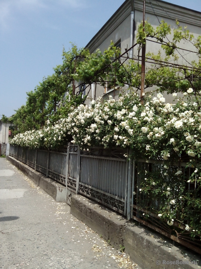 Каждый год фотографирую этот двор)). Жаль, что цветет эта красавица лишь в мае и недолго. Живут там совсем даже не АХ-какие розоманы,сорт неизвестный, но цветение ее дух захватывает). Со слов хозяина "просто мама посадила после войны эту розу, вот и растет уже 20 лет"