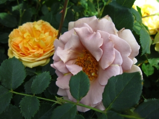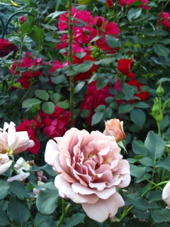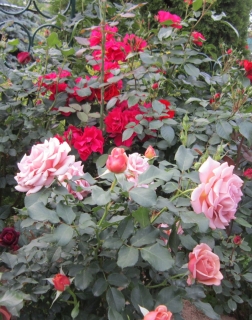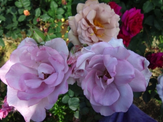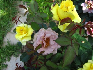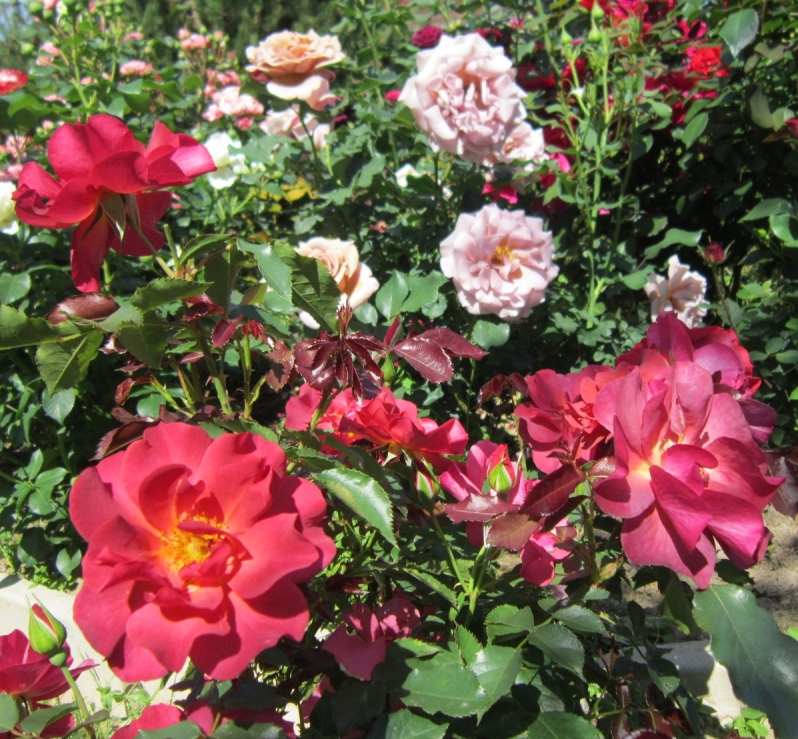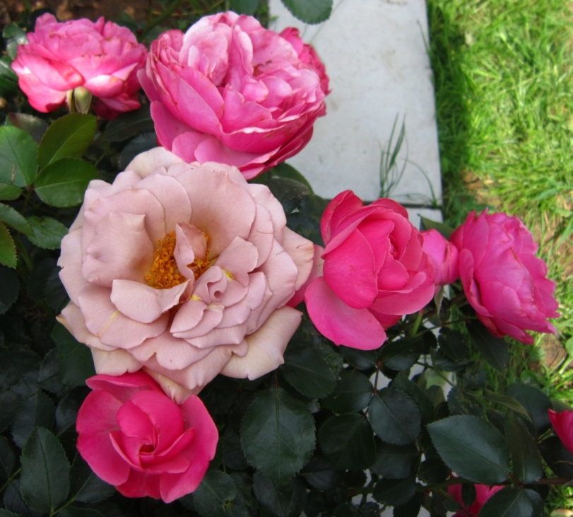 Роз, рекомендованных выше в качестве соседей, в моём саду нет, поэтому была посажена рядом с Cinco de Mayo с одной стороны, и в окружении розово-красных роз с другой.