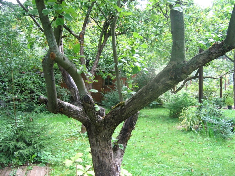 если вы про здоровье яблонь, то в таком виде как на фото они уже много лет, ту что у "сарая" (вообще это летняя баня) мы спилили (по причине высыхания) лет 11 назад, сейчас весь пенек сухой, никакой гнили там нет, в оставшемся стволе муравейник, но я ничего не трогаю потому что яблоня отлично растет, исключительно обильно плодоносит, ничем не болеет (относительно всего остального) - зачем ей мешать. если бы яблоню что-то не устраивало она бы это показала.