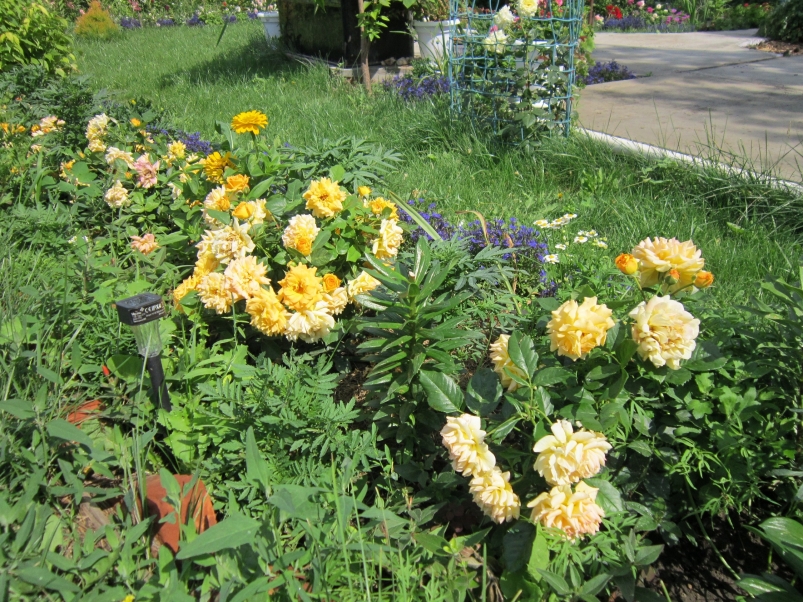 Видите как бывает))))).Кустик этот хризантема-шарик, низкорослая, мелко цветковая желтого цвета . Я для себя открыла такие хризантемы случайно. абсолютно не портят и не забивают розу.Заполняют пустоту. А цветет осень или не успевает зацвести, как погода. И смотрится шариком.с пупыришками.