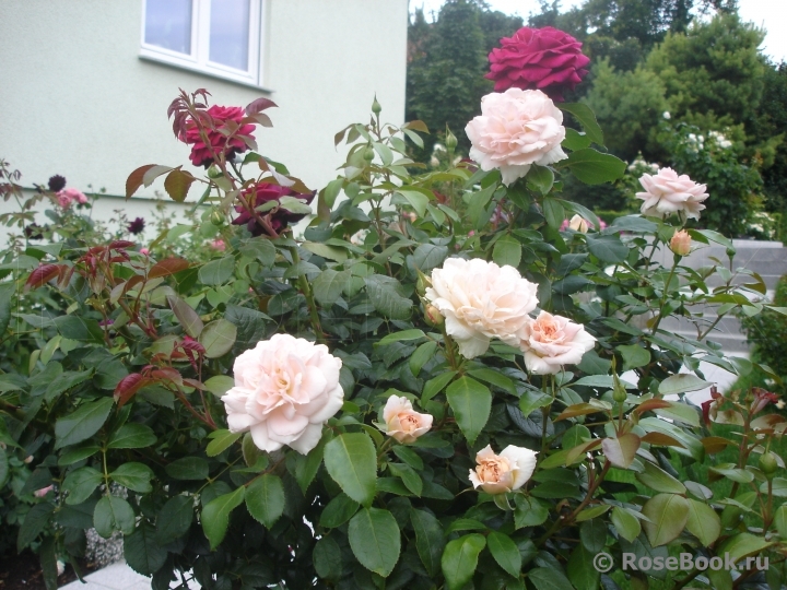 Когда на моём штамбе Lions-Rose вдруг стали появляться пурпурные бутоны, я просто оторопела. Приглядевшись повнимательней, увидела, что растущая неподалеку от штамба Графиня выдала вот такой побег, ростом выше штамба, который оказался прямо внутри его кроны.