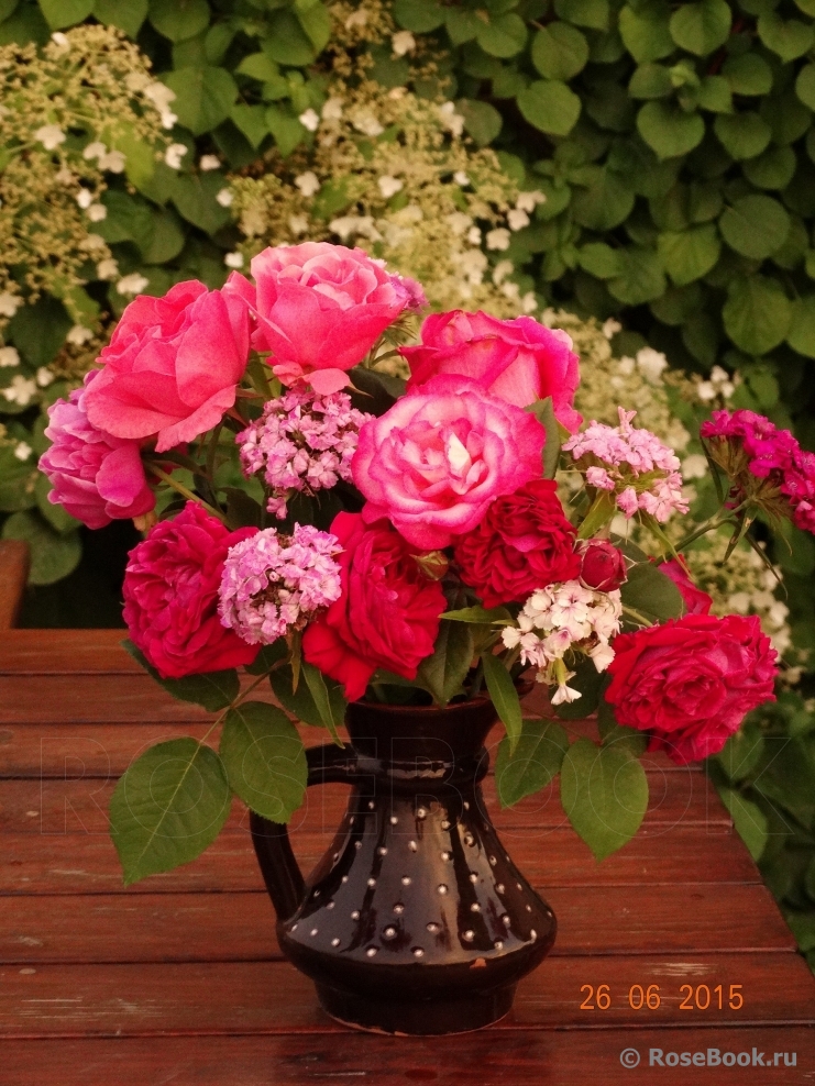 В букете: Handel, Queen Elizabeth,Ravel,незнакомка и турецкая гвоздика. Фон - гортензия черешкововидная.
