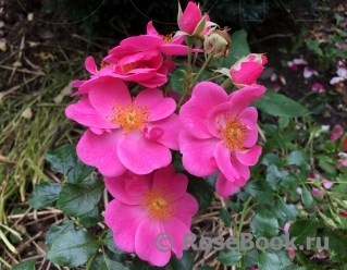 Полу-махровые, насыщенно-розовые с пучком желтых тычинок в центре, цветки в многочисленных соцветиях. |