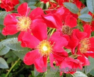 Описание:Этот шраб с некрупной, блестящей листвой и простыми, с открытой серединой темно-красными цветами можно отнести к категории почвопокровных роз. Цветы без запаха, цветение непрерывное в течение всего сезона. (HMF, Розовый питомник в Эстонии в г. Пылтсама eestiroos.ee)