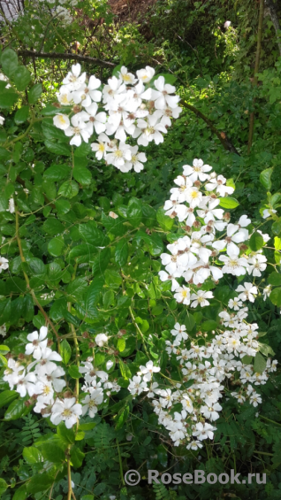 Описание:Плетистая бесшипная роза цветущая букетами простых мелких белых цветков, ароматная. Однократное цветение весной или летом, позже - гроздья красно-оранжевых элегантных плодов.
