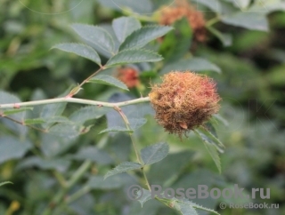 Розанные орехотворки – несколько видов насекомых-орехотворок, откладывающих свои яйца в стебли роз. Их личинки становятся причиной образования на стеблях наростов или галлов (диаметром 5-50 мм). Одни виды образуют галлы на стеблях, эти галлы имеют густые длинные волоски и по виду напоминают мох. Другие образуют галлы у корня, и эти галлы внешне напоминают бородавку. Если взять такой галл и разрезать, то в середине можно увидеть множество личинок, которые там развиваются. Яйца орехотворки откладывают в листья и побеги роз в мае-июне. Способы борьбы: на сегодняшний день инсектицидов, при помощи которых можно было бы эффективно бороться с этими насекомыми, не существует (можно попробовать системные). Поэтому лучшим способом борьбы в случае образования галла является обрезка зараженных стеблей и незамедлительное его сжигание, прежде чем из них вылупятся новые особи. Фото: https://otvet.mail.ru/question/64027333 http://ju-be.livejournal.com/24964.html?thread=49796 http://molbiol.ru/forums/index.php?act=Print&client=printer&f=53&t=276987