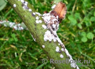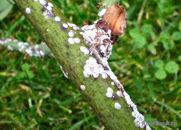Щитовка розанная (Aulacaspis rosae) встречается на побегах роз, шиповника, ежевики и земляники, она сильно портит сосудистую систему ствола. Выделяет падь – сладковатую жидкость, представляющую собой благоприятную среду для развития грибка. Подвижны в стадии микроскопических личинок, а по мере роста и развития становятся неподвижными (во взрослом состоянии). Места локализации: листья, старые ветки и стебли. Признаки поражения: на нижней стороне листьев и вдоль стебля скапливаются небольшие белые бляшки (именно так выглядят неподвижные щитовки, присосавшиеся к растению). При сильном поражении листья покрываются падью, желтеют и опадают, растение замедляет рост и даже может погибнуть. Меры защиты и борьбы с вредителем: - чаще всего щитовки появляются на ослабленных розах, растущих при недостаточном уходе, на очень сухих или влажных участках; - на начальной стадии: насекомых просто удаляют влажной тряпочкой или зубной щеткой; - растение смазывают следующей смесью: Смесь готовят из 1 части толченого чеснока, 1 части измельченного мыла и 3 частей воды. Готовую смесь наносят на сутки, после чего смывают. Обработку повторяют несколько раз с интервалом в 7-10 дней вплоть до полного исчезновения вредителя; - опрыскивание суточным настоем листьев грецкого ореха; - опрыскивание мыльным раствором; - опрыскивание керосиново-мыльным раствором (на 1 л воды - 40 г хозяйственного мыла и 5 капель керосина); - обработка пораженных участков метилированным спиртом; - крайнее средство борьбы со щитовкой – использование системных инсектицидов; - при сильном заражении – обрезка и сжигание поражённых побегов. Фото: http://www.vashsad.ua/plants/room_plants/vermin/articles/show/7747/ http://floweryvale.ru/garden-calendar/calendar-pest-supplies.html