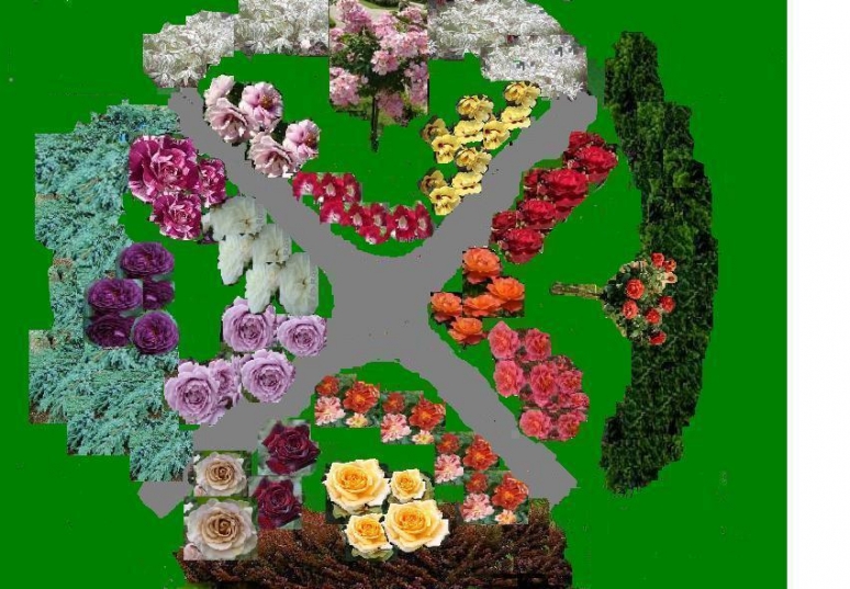 Здравствуйте друзья. План розария оказался несколько переработан, ибо участок стал теперь круглым и уменьшался до 8х8. По сравнению с оригинальным выброшены остинки. Теперь это выглядит так: