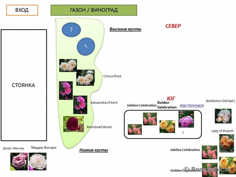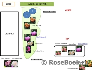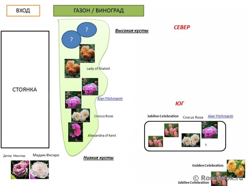 Весной планирую освоить участок длиной 7 м и шириной от 110 до .... На картинке он зелёный (вдоль стоянки). То, что уже посажено рядом я также обозначила. Изначально планировалась полоска из шрабов в розовато-сиреневой гамме, но решила все-таки остановиться на Остинках. На плане я указала те сорта, которые мне понравились по описанию и отзывам, но хотелось бы услышать специалистов...и под вопросом две высокие розы (за ними будет газон и дальше стенка из винограда) - эта пара роз будет встречать входящих на участок :). Очень жду любые советы