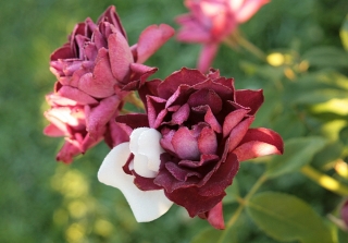 Друзья, предлагаю подробнее поговорить о сорте Burgundy Ice. И вот почему. Этот сорт я посадила весной 2012 года, то есть рос он у меня уже три сезона. Куст здоровый, красивый, дорос до 130 см, цветёт обильно - не нарадуюсь. Но в июле прошлого сезона вдруг на одной из веток я заметила цветок с бледно-розовой полосой на одном из лепестков. Затем на той же ветке распустился цветок с несколькими белыми лепестками.