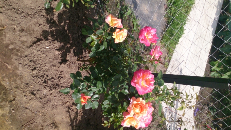 | Роза плетистая, куплена год назад на рынке у частника. Голенастый ствол, побеги прямостоячие, толстые, плохо гнуться. Цветки полумахровые, неплотные, крупные. По два-пять в соцветии. Цвет: бутоны оранжево-белые, цветки на начальной стадии коралловые, терракотовые лепестки с соломенно желтым ярким основанием. Далее становятся нежно неоново-розовыми, с бледно-желтыми основагиями и/ или белым основпнием. Цветет начиная с июля до конца августа пермоментно. Форма цветка: тип кувшинки. Шипы крупные, редкие. Листва темно зеленая, глянцевая зрелая, ранняя - салатовая. Аромат средне выражен, характерный для большинства роз, без специыических ноток. Очень эффекная, красивая роза.