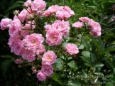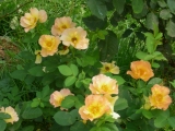 | В центре эта роза абрикосово-розовая, по краям лепестки розовеют. Цветы появляются в кистях по 5-10 цветов. Листва у этой розы темно-зеленая, некрупная, блестящая, очень красивая. |
