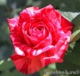Цвет красный, с темно-красными полосами и пятнами. От 31 до 39 лепестков. Цветки от среднего до крупного, махровые, ветви несут главным образом одиночные цветки, бокаловидные, высокие в центре. Непрерывное цветения в течение всего сезона.Куст высокий, густой, без шипов (или почти). Полу-глянцевая листва.Энергичный сорт. Очень устойчив болезни. |
