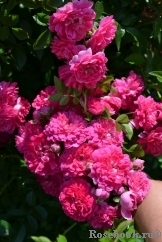 | Сильный шраб или невысокая плетистая роза с густомахровыми цветками ностальгической формы. Цветки малиновые, в кистях по 3-5 шт. Аромат сильный, фруктовый. Куст ветвистый, прямостоячий, до 1,5м. |