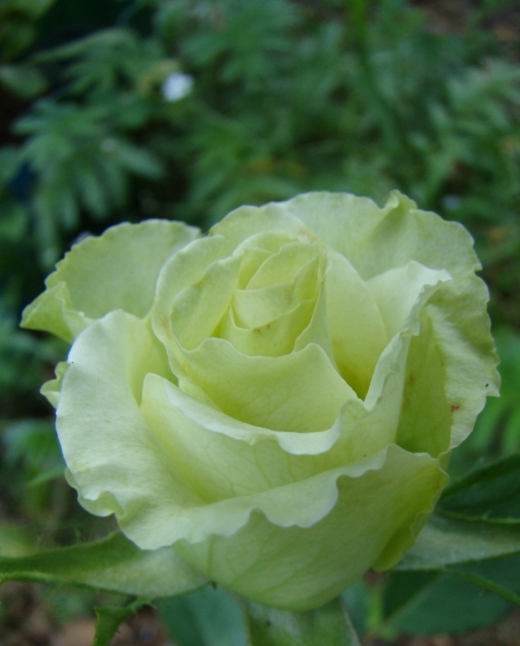 | Куст среднерослый, компактный, высота 60–80 см. Листья темно-зеленые, блестящие. Цветы градиентной расцветки от молочно-салатового в центре бутона до насыщенного нежно-салатового цвета к краям бутона, чашевидные, крупные, 10–12 см в диаметре, густомахровые (около 100 лепестков), одиночные. Аромат слабый. (HMF, lplod.ru) |