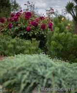 На переднем плане - Sangerhauser Jubilaumsrose, роза-одноневка