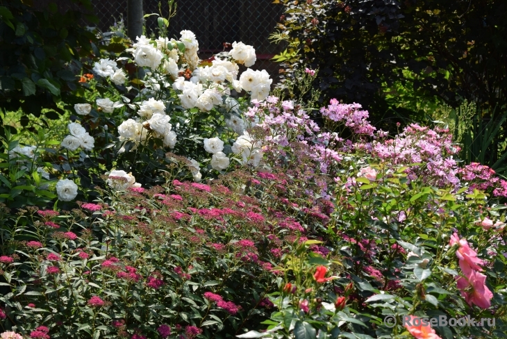Прекрасный гармоничный сад,очень приятные для глаз цветовые сочетания, отличная коллекция роз,смотрится феерично!